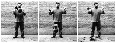 Dropping a Han Dynasty Urn è una serie di fotografie, censurata in Cina, che raffigura lo stesso artista reggere, successivamente lasciar cadere un’urna funeraria appartenente alla dinastia cinese Han con una storia di oltre 2000 anni alle spalle, e infine stante davanti ai cocci. La performance, vivibile dallo spettatore grazie ai tre scatti fotografici, pone al centro il tema della memoria storica della Cina e può essere riletta come un’aperta critica alla rivoluzione culturale che aveva visto coinvolto anche il padre dell’artista e che si concretizzò in un tentativo radicale da parte di Mao Zedong di riprendere il comando effettivo dello Stato. L’opera sembra, infatti, rivisitare le parole dell’appena citato ex Presidente del Partito Comunista cinese: “L’unico modo per costruire un nuovo mondo è distruggere quello vecchio”.